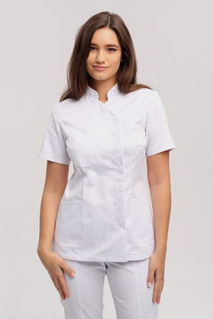 Women's medical jacket with universal neckline ZA 08, white, short sleeve, Premium