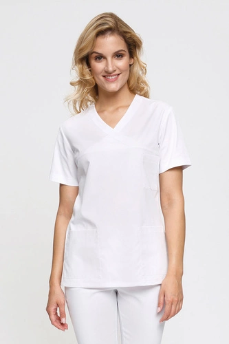 Women's medical jacket with universal neckline ZA 08, white, short sleeve, Premium