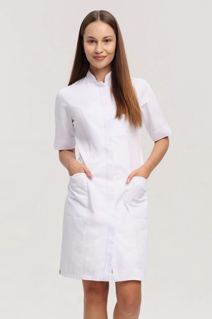 White medical dress with stand-up collar SU 16, short sleeve, Premium