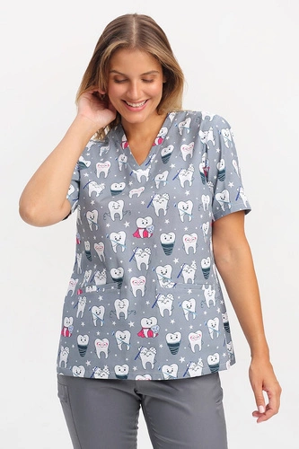 Bluza medyczna damska we wzorki kotki BL 55, krótki rękaw