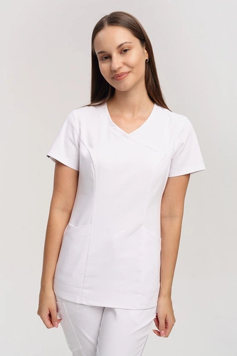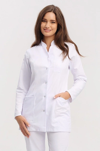 Żakiet medyczny damski biały z uniwersalnym dekoltem ZA 08, długi rękaw, Premium Stretch Cotton