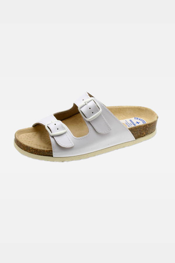 White women's and men's shoes with non-slip soles and cork-rubber insoles with full orthopaedic profile. Leather lining and upper, adjustable elasticity.