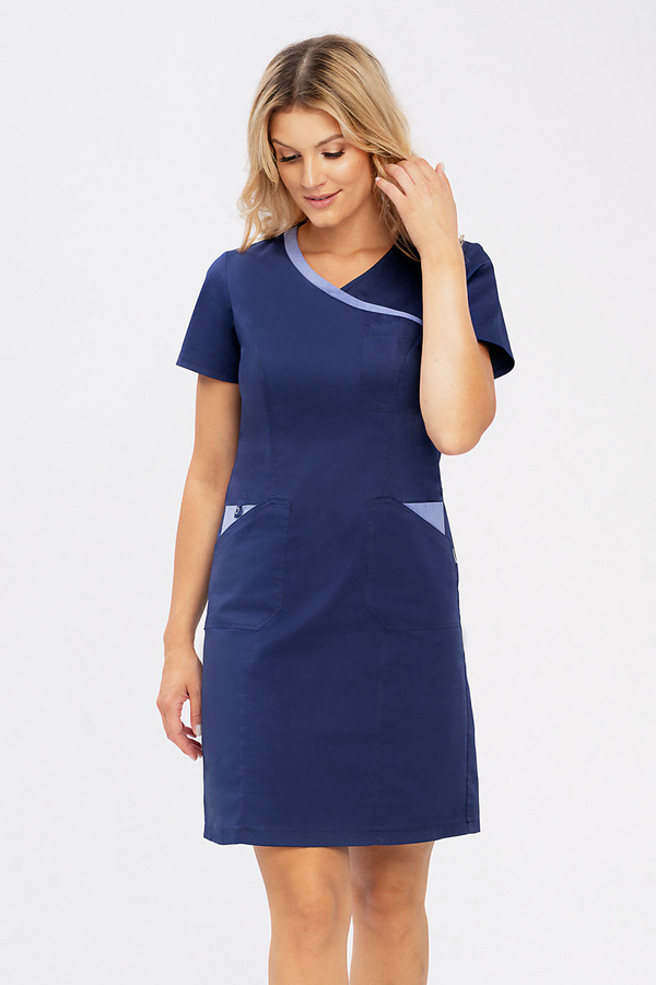 Opinie o Sukienka medyczna jasnogranatowa SU 50 z kontrastowymi dodatkami, krótki rękaw, Comfort Stretch