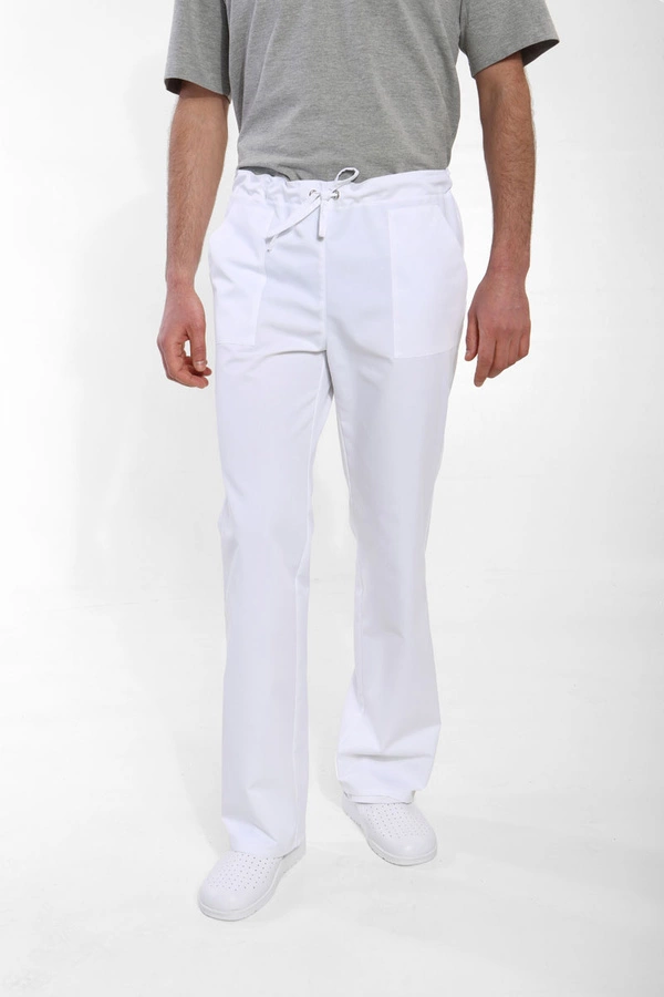 - Białe spodnie medyczne męskie wiązane na sznureczki z przodu
